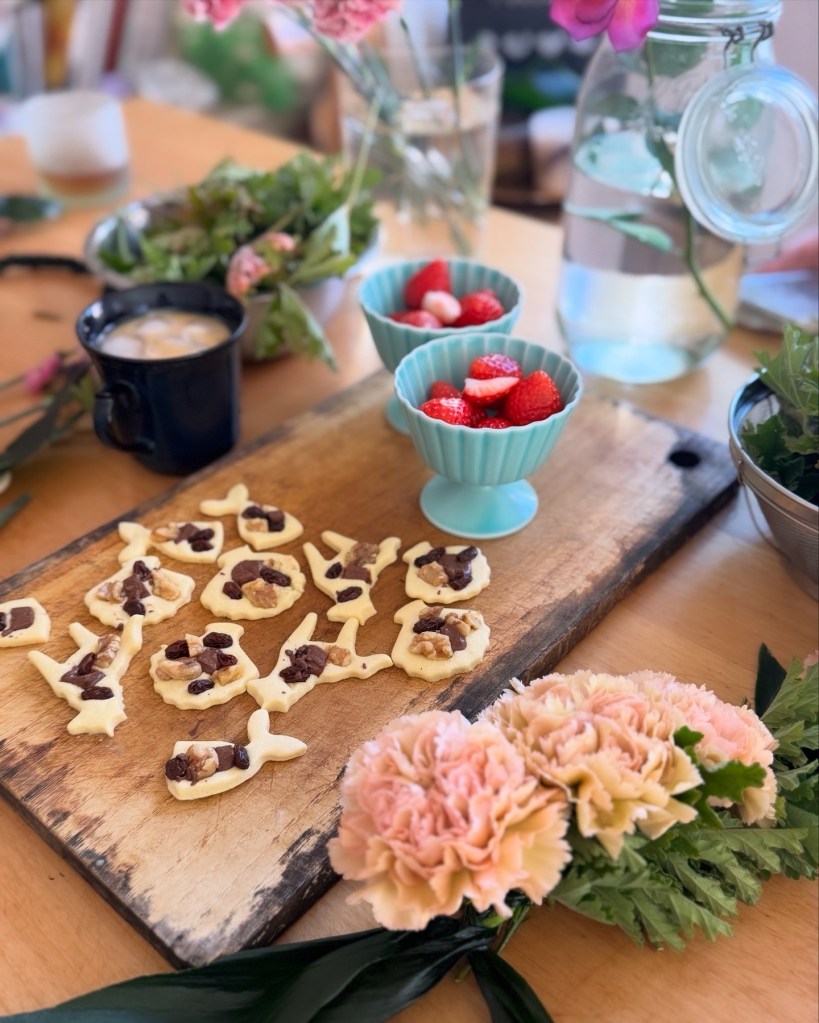 全然うまくできず、解いて最初からやりなおしたり、美味しい手作りクッキーにいちご、カフェラテをいただきながら休憩をはさみ、再開。